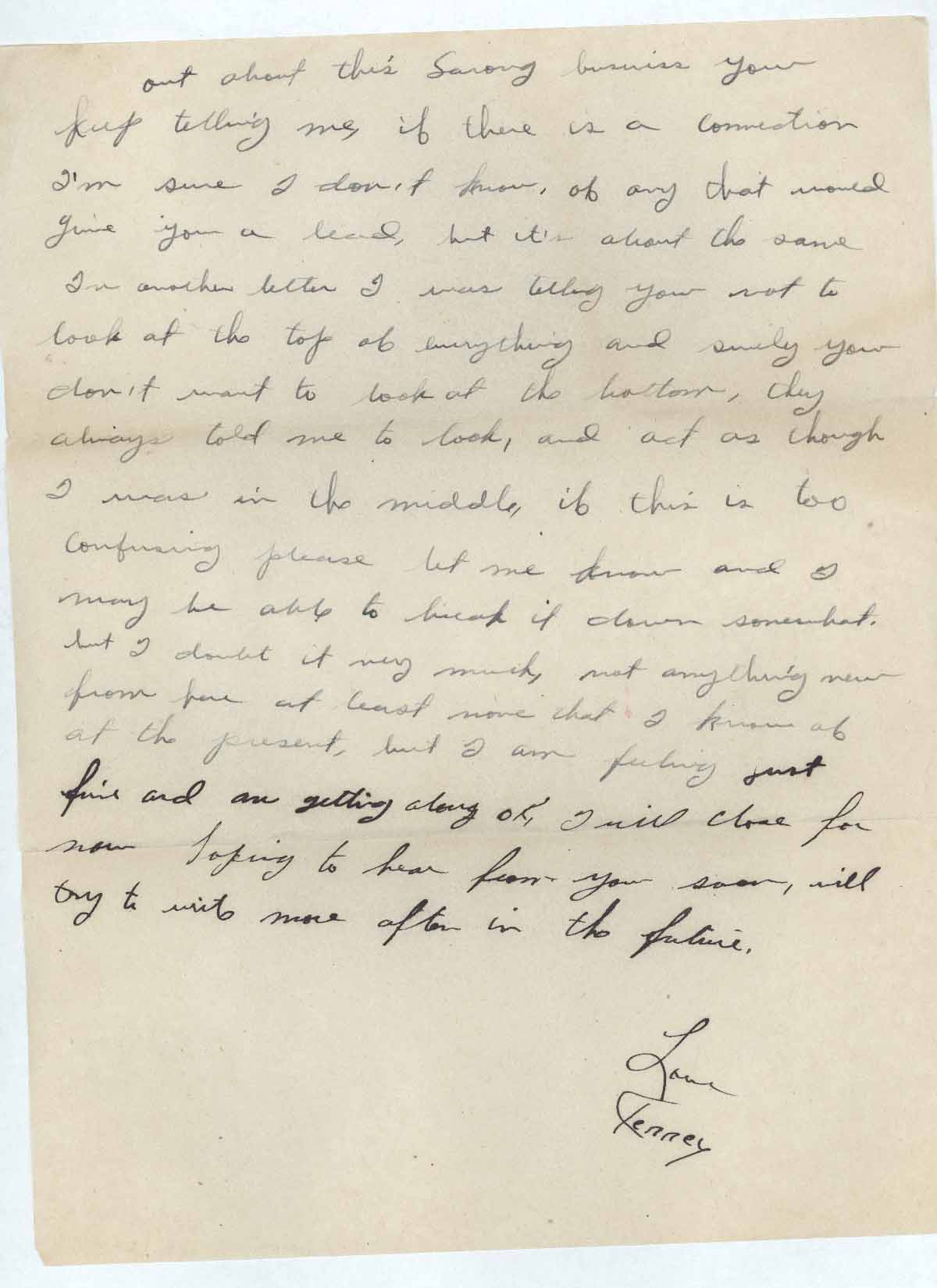 Out about this Sarong business you keep telling me, if there is a connection I’m sure I don’t know, of any that would give you a lead, but it’s about the same In [sic] another letter I was telling you not to look at the top of everything and surely you don’t want to look at the bottom, they always told me to look, and act as though I was in the middle, if this is too confusing please let me know and I may be able to break it down somewhat, but I doubt it very much, not anything new from here at least none that I know of at the present, but I am feeling just fine and am getting along OK, I will close for now Hoping to hear from you soon, will try to write more often in the future.