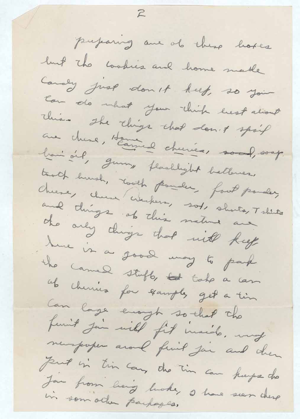 preparing one of these boxes but the cookies and home made candy just don’t keep, so you can do what you think best about this. The things that don’t spoil are thine [sic], have canned cherries, soad, soap, bran oil, gum,, [sic] flashlight batteries, tooth brush, tooth powder, foot powder, cheese, cheese crackers, sox, shorts, T shirts and things of this nature are the only things that will keep, here is a good way to pack the canned stuff, be take a can of cherries for example, get a tin can lage [sic] enough so that the fruit jar will fit inside, wrap newspaper around fruit jar and then put in can, the tin can keeps the jar from being broke, I have seen these in som [sic] other packages,