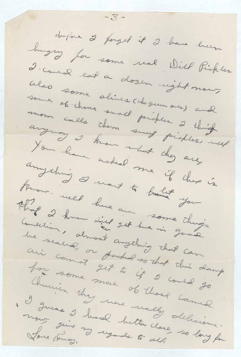 before I forget it I have been hungry for some real Dill Pickles I could eat a dozen right now, also some of those small pickles I think mom [sic] calls them sweet pickles, well anyway I know what they are, You [sic] have asked me if this is anything I want to have let you know, well here are some things that I know will get here in good condition, almost anything that can be sealed, or packed so that this damp air cannot get to it, I could go for some more of those canned cherries they were really delicious I guess I had better close, so long for now, give my regards to all.