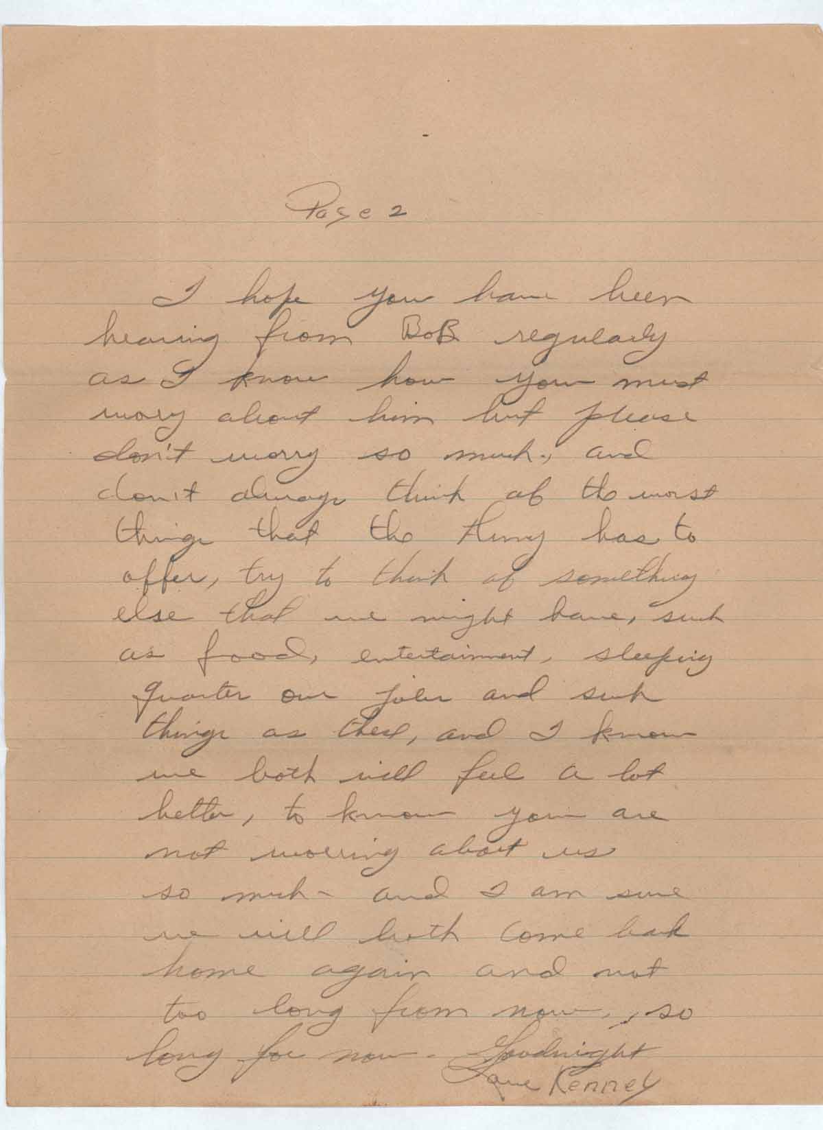 I hope you have been hearing from Bob regularly as I know how you must wory [sic] about him so much, but please don’t worry so much, and don’t always think of the worst things that the Army has to offer, try to think of something else that we might have, such as food, entertainment, sleeping quarter [sic] our john and such things as these, and I know we both will feel a lot better, to know you are not worrying about us so much- and I am sure we will both come back home again and not too long from now, so long for now. Goodnight