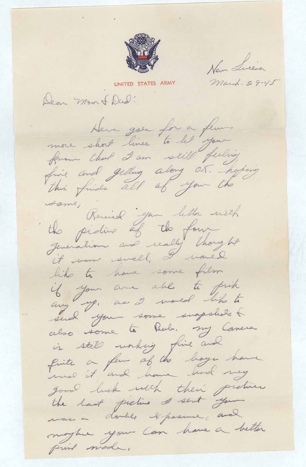 Recived [sic] your letter with the picture of the four generations and really thought it was swell, I would like to have some film if you are able to pick nay up, as I would like to send you some snapshots & also some to Bob, my camera is still working fine and quite a few of the boys have used it and have had very good luck with their pictures the last picture I sent you was a double exposure, and maybe you can have a better print made.