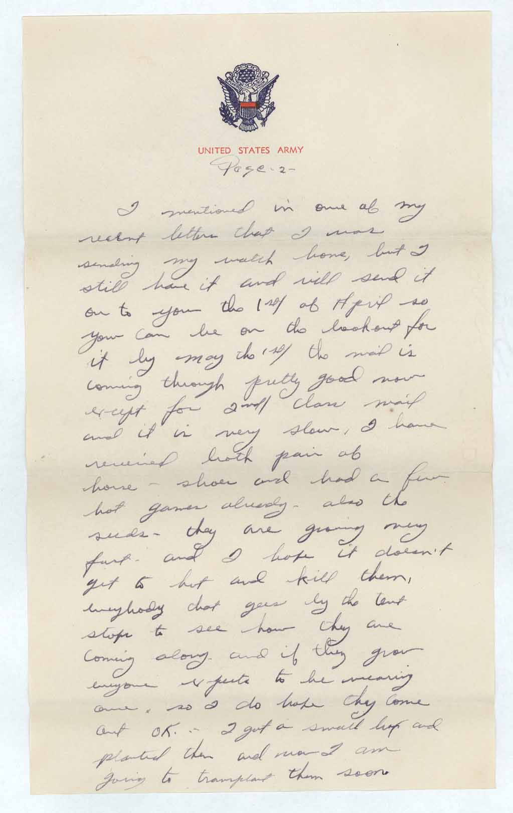 I mentioned in one of my recent letters that I was sending my watch home, but I still have it and will send it on to you the 1st/ of April so you can be on the lookout for it by May the 1st/ the mail is coming through pretty good now except for 2nd/ class mail and it is very slow, I have received both pair of horse – shoes and had a few hot games already- also the seeds, they are growing very fast, and I hope it doesn’t get to [sic] hot and kill them, everybody that goes by the tent stops to see how they are coming along and if they grow everyone expects to be [receiving some], so I hope they come out OK. I got a small box and planted them and now I am going to transplant them soon.