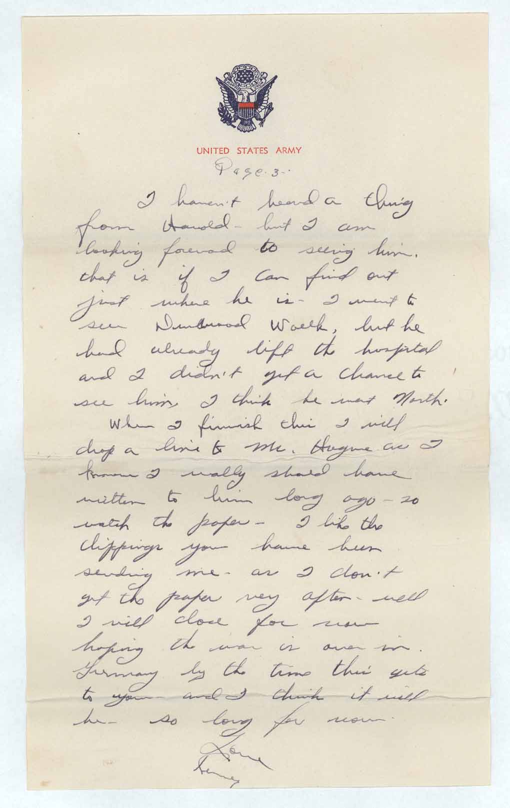 When I finish this I will drop a line to Mr. [Hugme] as I know I really should have written to him long ago, so watch the paper, I like the clippings you have been sending me, as I don’t get the paper very often, well I will close for now hoping the war is over in Germany by the time this gets to you and I think it will be so long for now.