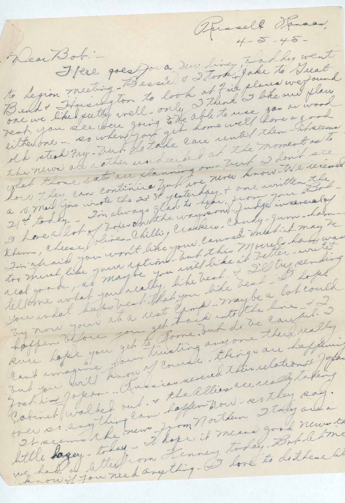 Here goes for a few lines, Daddy went to Legion meeting-Bessie & I took Jake to Great Bend & Hoisington to look at five places we found one we liked pretty well _ only I think I like our place best, you see were going to be able to use gas or wood either one_ so when you get home we’ll have a good old steak fry. But do take care until then- it seems the news are rather undecided at the moment as to what those rats are planning on_ but I don’t see how they can continue but we never know. We received a v. mail you wrote the 23rd yesterday & one written the 21st today_ I’m always glad to hear from you Bob- I have a lot of boxes on the way son [sic] fudge in several of them, cheese, olives_ chilli [sic], crackers, candy-gum-ham-I’m afraid you won’t like your canned meat- it may be too much like your rations-but this Morrels ham was real good, so maybe you will like it better-write & tell me what you really like best & I’ll try sending you what keeps best that you like best-I hope by now your at a rest camp- maybe a lot could happen before you get back into the lines-& I sure hope you get to Rome, but you do be careful. I can’t image you trusting anyone there really but you know of course things are happening [gosh] in Japan. Russias [sic] severed their relations & Japans [sic] Cabinet walked out & the Allies are really taking over so anything can happen now- so they say. It seems the news from Northern Italy are[sic] a little hazey-today- I hope it means good news thos-[sic] we had a letter from Kenney today. Bob let me know if you need anything. I love to do these little