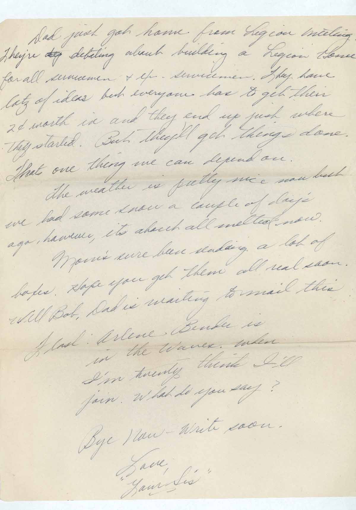 Dad just got home from Legion meeting. They’re dep debating about building a Legion House for all servicemen & ex-servicemen. They have lotz [sic] of ideas but everyone has to get their 2¢ worth in and they end up just where they started. But they’ll get things done. That’s one thing we can depend on.