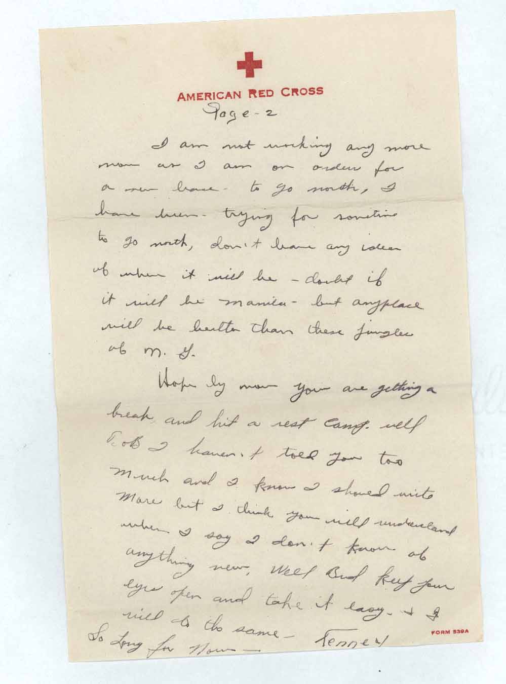 I am not working any more now as I am on orders for a new base to go north, I have been trying for sometime to go north, don’t have any idea of when it will be-doubt if it will be Manila-but anyplace will be better than these jungles of N.G.