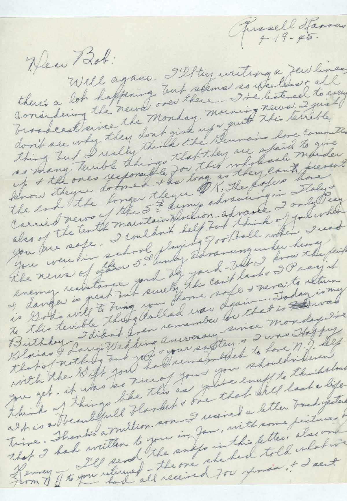 Well again, I’ll try writing a few lines, there’s a lot happening but seems so useless & all considering the news over there. I’ve listened to every broadcast since the Monday morning news! I just don’t see why they don’t give up & quit this terrible thing but I really think the German’s have committed so many terrible things that they are afraid to give up & the ones responsible for this wholesale murder know theyre [sic] doomed & as long as they cant prevent the end the longer theyre [sic] O.K. The papers have carried news of the 5th army advancing in Italy & also of the tenth mountain Division advance I only Pray [sic] you are safe. I couldn’t help but think of you when you were in school playing Football [sic] when I read the news of you’re the 5th army advancing under heavy enemy resistance yard by yard- but I know the field &, danger is great but surely this can’t last & I Pray it is God’s will to bring you home safe & never to return to this terrible thing called war again.. [sic] Today is my Birthday. I didn’t even remember or that is F-he was Glorias [sic] & Larry’s Wedding Aniversary [sic], since Monday I’ve thot [sic] of nothing but you & your safety & I was Happy with the Gift you had remembered to have N.J. help you get- it was so nice of you & you shouldn’t even thin k of things like that as you’ve enuff [sic] to think about It is a beautiful Handel & one that will last a life time. Thanks a million son- I received a letter back yesterday that I had written you in Jan. with some picture. I --- Kenney- I’ll send the snaps in this letter. also one from N.J. to you returned-the one she had told what we ---had all received for xmas & I sent
