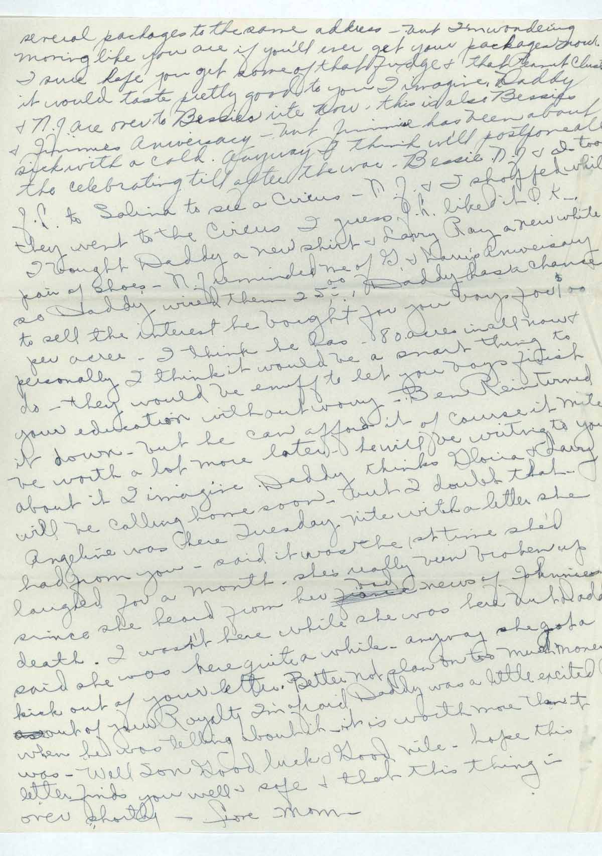 Several packages to the same address- but I’m wondering moving like you are if you’ll ever get your packages now. I sure hope you get some of that fudge & that Peanut Cluster it would taste pretty good to you I imagine. Daddy & N.J. are over to Bessies [sic] rite [sic] now, this is also Bessies & Jimmies [sic] Anniversary- but Jimmie has been about sick with a cold. Anyway I think we’ll postpone all the celebrating till after the war. Bessie [sic] N.J. & I took L.R. [sic] to Salina to see a circus- N.J. & I shopped while they went to the circus I guess L.h. [sic] liked it O.K.- I bought Daddy a new shirt & Larry Roy a new white pair of shoes-N.J. reminded me of G. & Larry’s Aniversary [sic] so Daddy wired them 25.00 [sic], Daddy has a chance to sell the interest he bought for you boys for $100 per acre. I think he has – 80 acres in all now & personally I think it would be a smart thing to do- they would be enuff [sic] to let you boys finish your education without worry. Ben Rein turned it down, but he can afford it of course it mite [sic] be worth a lot more later- he will be writing to you about it I imagine. Daddy thinks Gloria & Larry will be calling home soon- but I doubt that. Angeline was here Tuesday nite [sic] with a letter she had from you- said it was the 1st time she’d laughed for a month, she really been broken up since she heard from her fiancé bad news of Johnnies [sic] death. I wasn’t here while she was here but Dad said she was here quite a while anyway she got a kick out of your letter. Better not plan on too much money as out of your Royalty I’m afraid Daddy was a little excited when he was telling about it-it is worth more than t [sic] was- Well Son Good luck & Good nite- hope this letter finds you well & safe & that this thing is over shortly- Love –Mom-