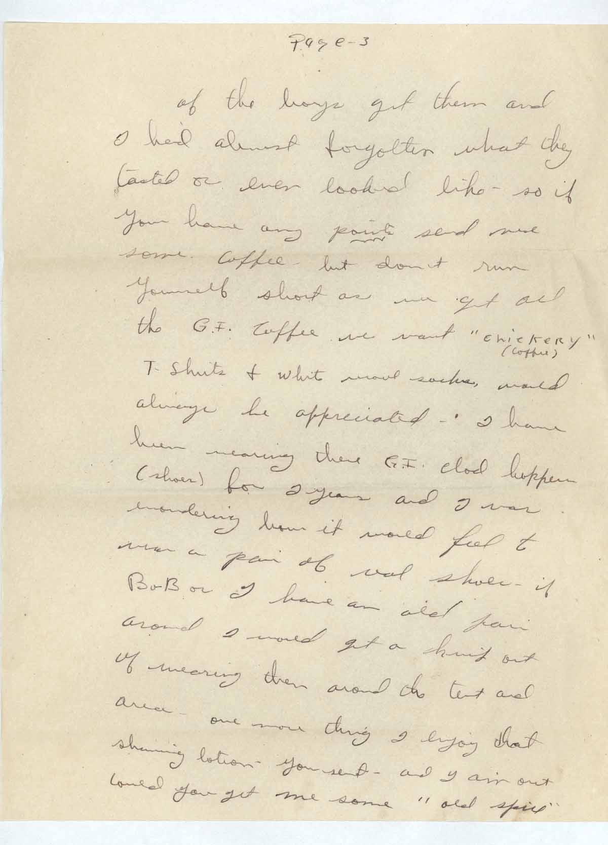 of the boys get them and I had almost forgotten what they tasted or even looked like, so if you have any points send more some coffee, but don’t run yourself short as we get all the G.I. Coffee we want “chickery” [sic] (coffee) T-shirts & white wool socks, would always be appreciated-. I have been wearing there G.I. clod hoppers (shoes) for 2 years and I was wondering how it would feel to wear a pair of real shoes, if Bob or I have an old pair around I would get a kick out of wearing them around the tent and area- one more thing I enjoy that shaving lotion you sent, and I am out could you get me some “old spice”