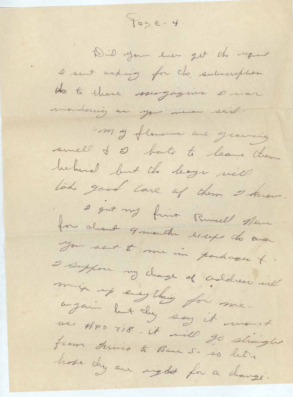 I got my first Russell News for almost 9 months except the over you sent to me in packages. I suppose my change of address will mix up everything for me, again but they say it won’t as APO 718 it will go straight from Frisco [sic] to Base s, so let’s hope they are right for a change.