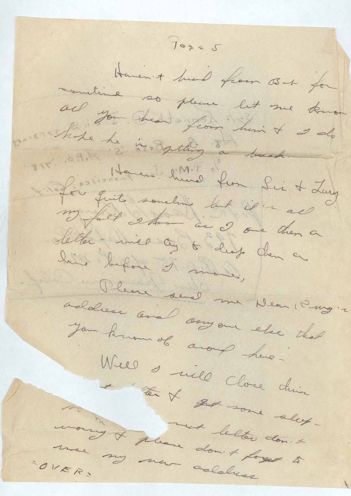 Well I will close this [letter missing due to tear] letter & get some sleep [tear] next letter don’t worry & please don’t forget to use my new address =OVER=