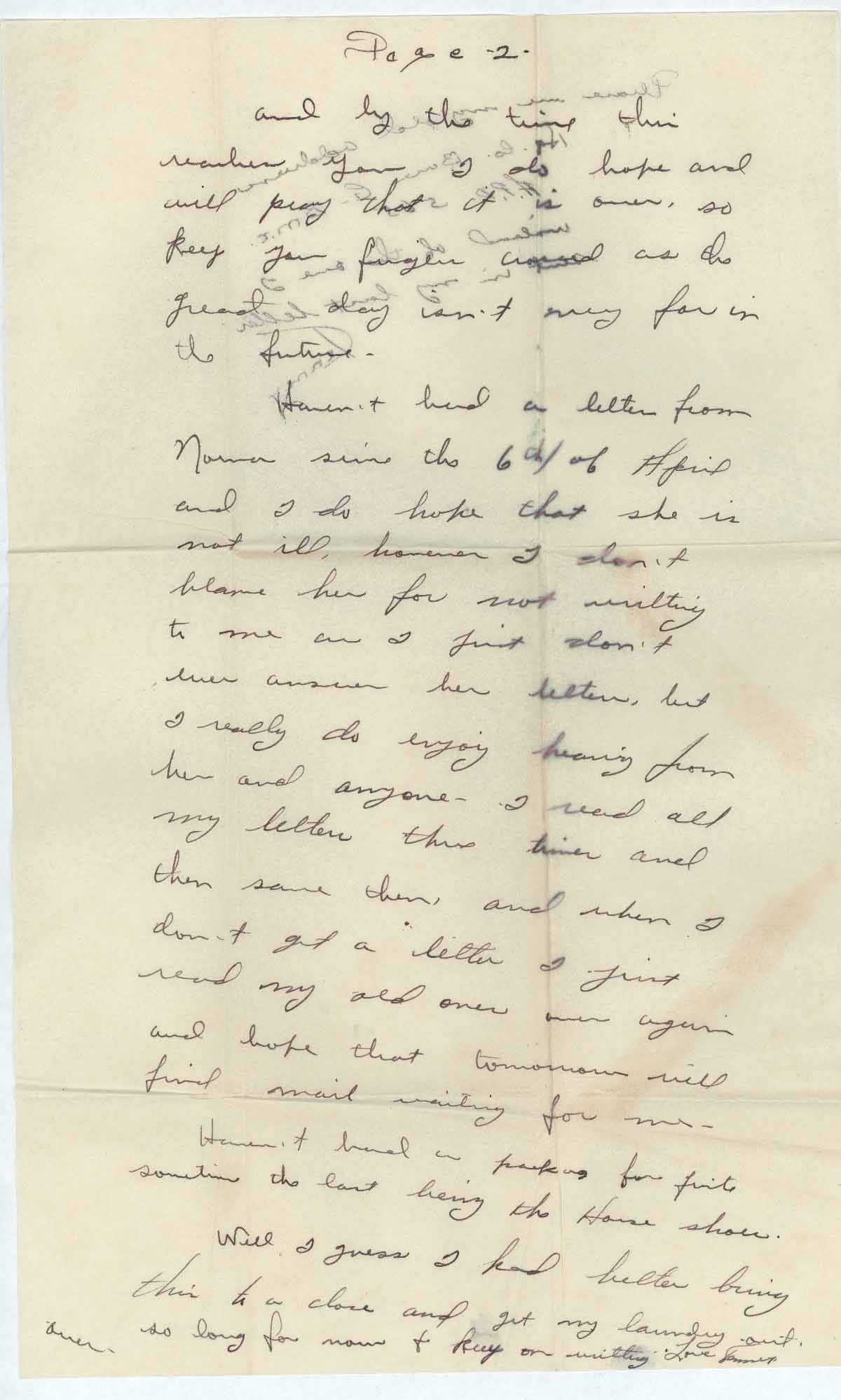 Haven’t had a package for quite sometime the last being the horseshoes. Well I guess I had better bring this to a close and get me laundry out so long for now & keep on writting [sic]. Love Kenney