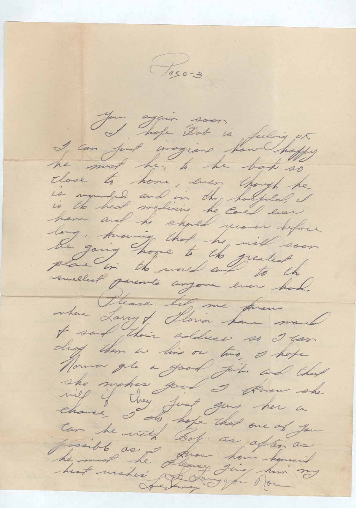I hope Bob is feeling OK. I can just imagine how happy he must be, to be back so close to home, even though he is wounded and in the hospital, it is the best medicine he could ever have and he should recover before long, knowing that he will soon be going home to the greatest place in the world and to the swellest parents anyone ever had.