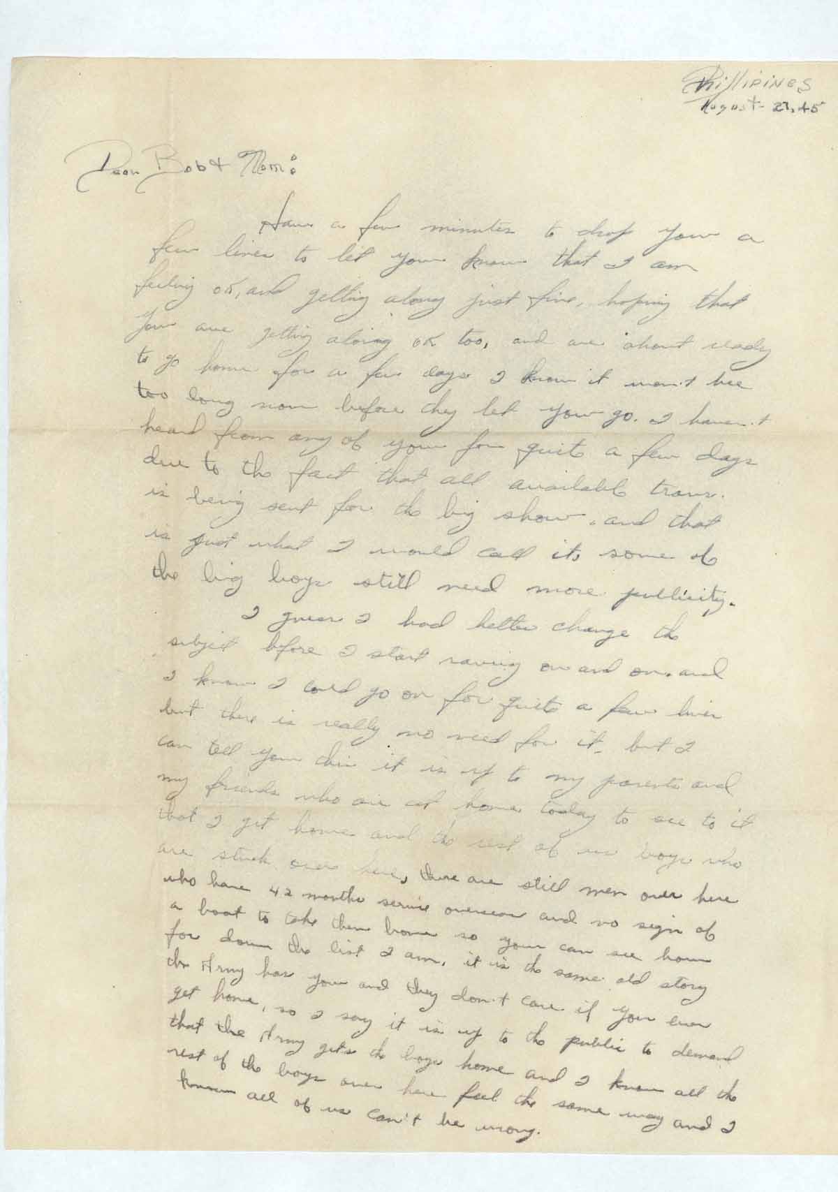 I guess I had better change the subject before I start raving on and on and I know I cold [sic] go on for quite a few lines but there is really no need for it, but I can tell you this it is up to my parents and my friends who are at home today to see to it that I get home and the rest of use boys who are stuck over here, there are still men over here who have 42 months service overseas and no sign of a boat to take them home so you can see how far down the list I am, it is the same old story the Army has you and they don’t care if you ever get home, so I say it is up to the public to demand that the Army gets the boys home and I know all the rest of the boys over here feel the same way and I know all of us can’t be wrong.