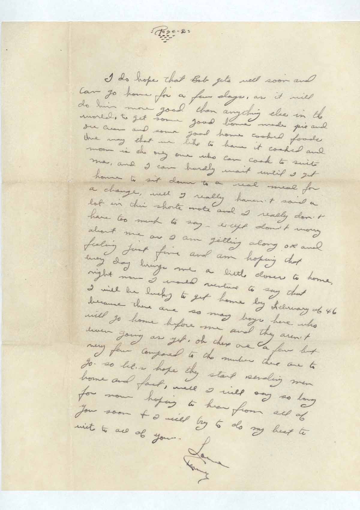 I do hope that Bob gets well soon and can go home for a few days, as it will do him more good than anything else in the world, to get some good home made pies and ice cream and some good home cooked foods the way that we like to have it cooked and mom [sic] is the only one who can cook to suit me, and I can hardly wait until I get home to sit down to a real meal for a change, well I really haven’t said a lot in this short note and I really don’t have too much to say, except don’t worry about me as I am getting along OK and feeling just fine and am hoping that every day brings me a little closer to home, right now I would venture to say that I will be lucky to get home by February of 46 because there are so may [sic] boys here who will go home before me and they aren’t even going as yet. oh [sic] there are a few but very few compared to the numbers there are to go so let’s hope they start sending men home and fast, well I will say so long for now hoping to hear from all of you soon & I will try to do my best to write to all of you.