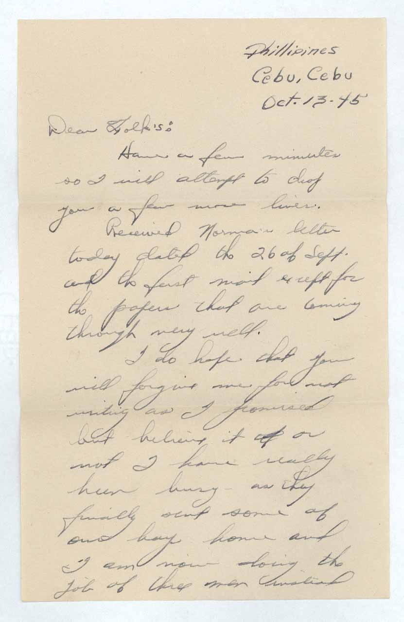 Received Norma’s letter today dated the 26 of Sept. and the first mail except for the papers that are coming through very well.
