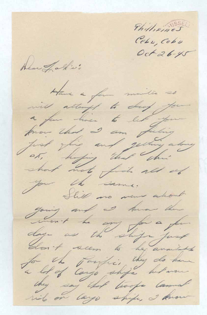Still no news about going and I know there won’t be any for a few days as the ships just don’t seem to be available for the Pacific; [sic] they do have a lot of Cargo ships now they say that troops cannot ride on Cargo ships, I know