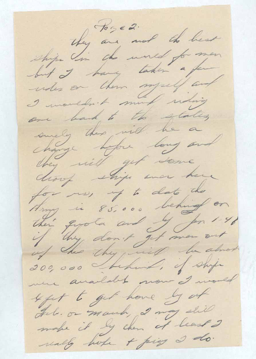 they are not the best ships in the world for men but I have taken a few rides on them myself and I wouldn’t mind riding one back to the states, surely there will be a change before long and they will get some troop ships over here for us, up to date the Army is 85,000 behind on ther, [sic] quota and by Jan 1-46 of they don’t get men out of here they will be almost 200,000 behind, if ships were available now I would expect to get home by at [sic] Feb. or March, I may still make it by then at least I really hope & pray I do.