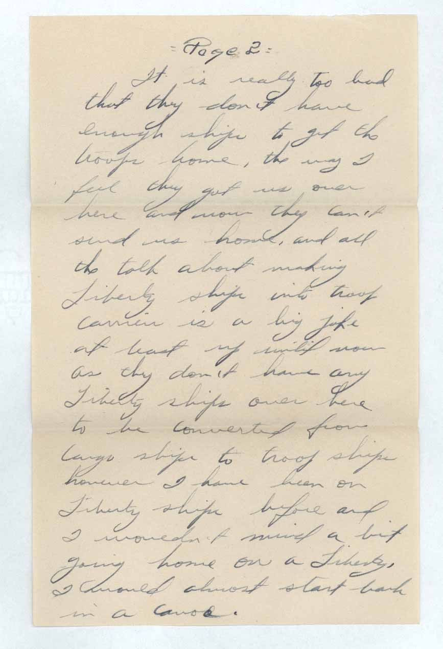 It is really too bad that they don’t have enough ships to get the troops home, the way I feel they got us over here and now they can’t send us home, and all the talk about making Liberty [sic] ships into troop carries is a big joke at least up until now as they don’t have ay Liberty ships over here to be converted from Cargo ships to troop ships however I have been on Liberty ships before and I wouldn’t mind a bit going home on a Liberty, I would almost start back in a canoe.