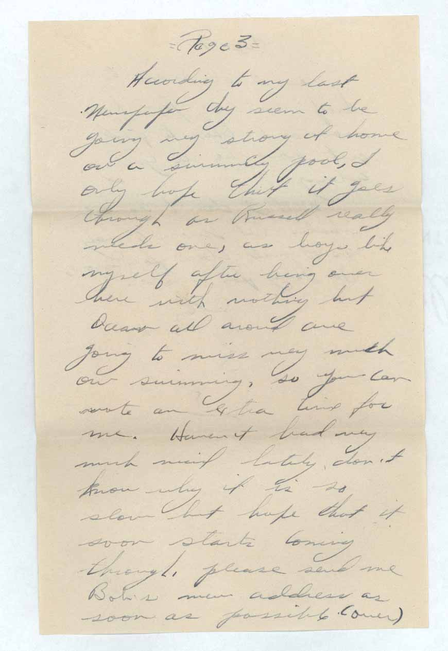 According to my last Newspaper [sic] they seem to be going very strong at home on a swimming pool, I only hope that it goes through as Russell really needs one, as boys like myself after being over here with nothing but Ocean all around are going to miss very much our swimming, so you can vote an extra time for me. Haven’t had very much news lately, don’t know why it is so slow but hope that it soon starts coming through, please send me Bob’s new address as soon as possible (over)