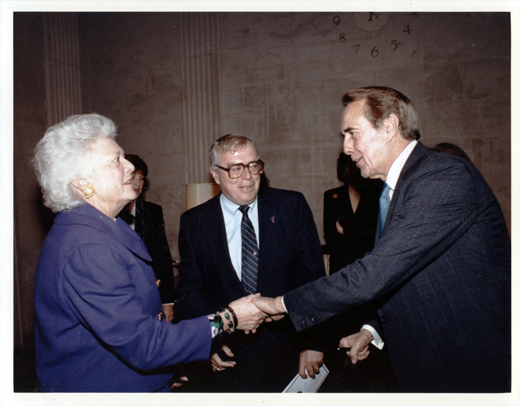 Barbara Bush shaking hands with Bob Dole, with James Molloy looking on, 2 poses, 1994-11 | Dole Archive Collections