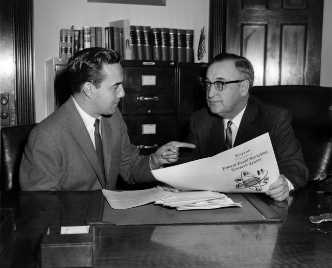 Item 1: Bob Dole and Carl Andersen read a proposal. Notes: Kansas. Dole explained to Andersen that Kansas would be an ideal location because of its strategic location in the Great Plains region, the most important grain producing area in the U.S. Dole and other interested Kansans will appear before the (more) -- Inscriptions: Cong. Bob Dole is pictured with Cong. H. Carl Anderson of MN, ranking Republican on the House Agricultural Appropriations Subcommittee, as they confer about the possibility of locating the proposed U.S.D.A. Grain Marketing Research Center in (cont. in BN).