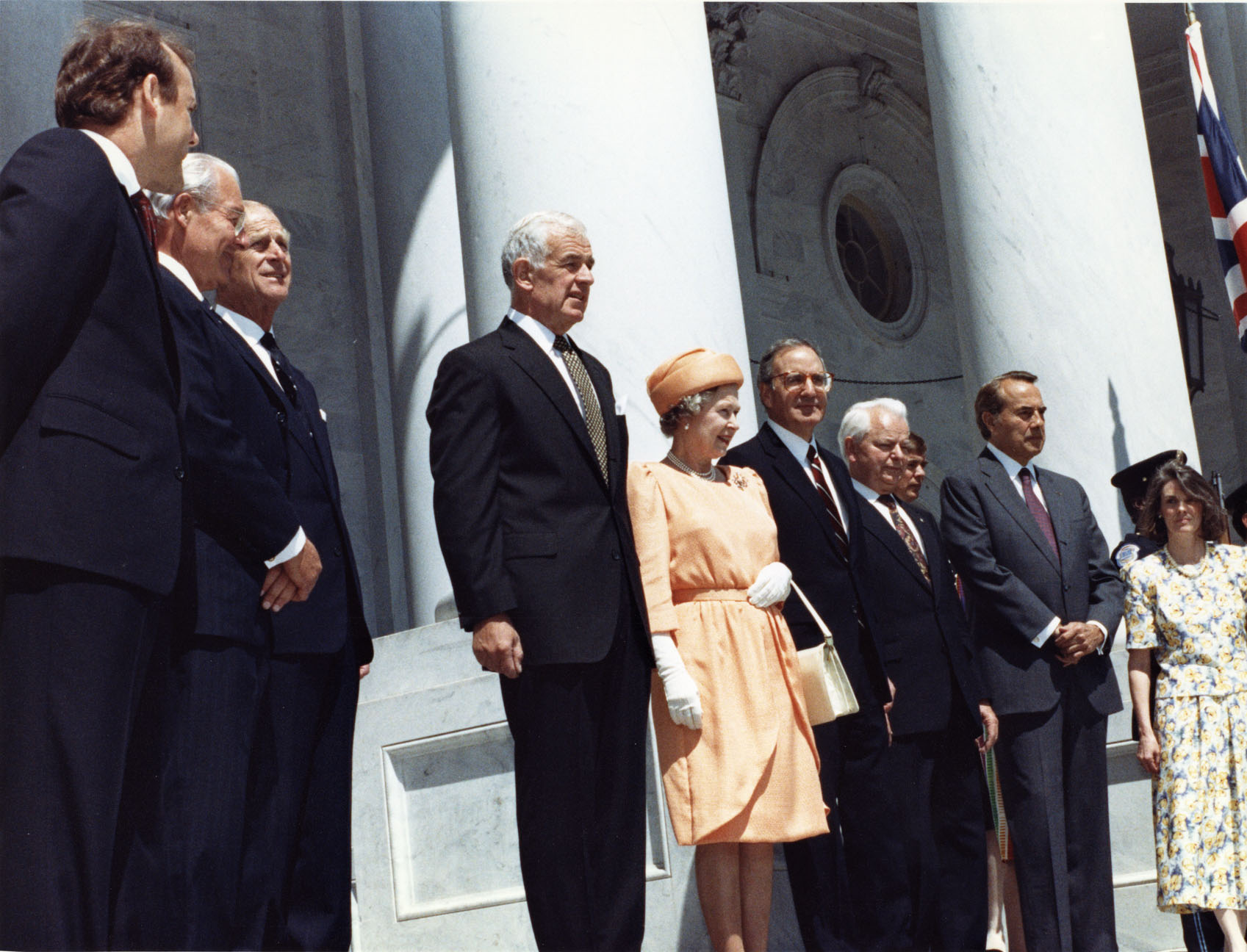 Queen Elizabeth II in front of columns | Dole Archive Collections