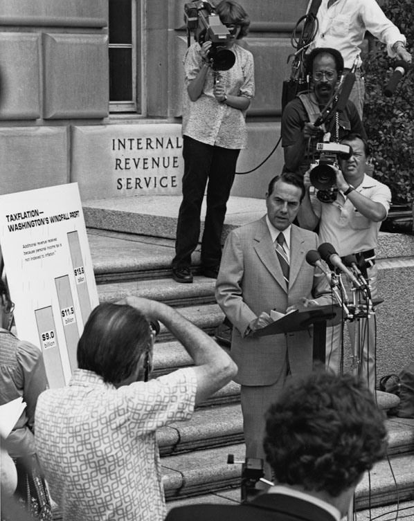 Dole, Robert J., 1923-; Dole is giving a speech at a podium in front of the Internal Revenue Service building, IRS, to Dole's left is a bar graph of Taxflation Washington Windfall, the speech is being recorded by reporters Notes: Dole discusses windfall (taxflation ) tax profit.