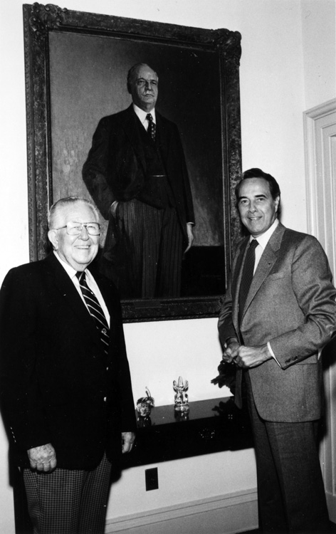 Huck Boyd standing with Bob Dole in front of the portrait of Charles Curtis