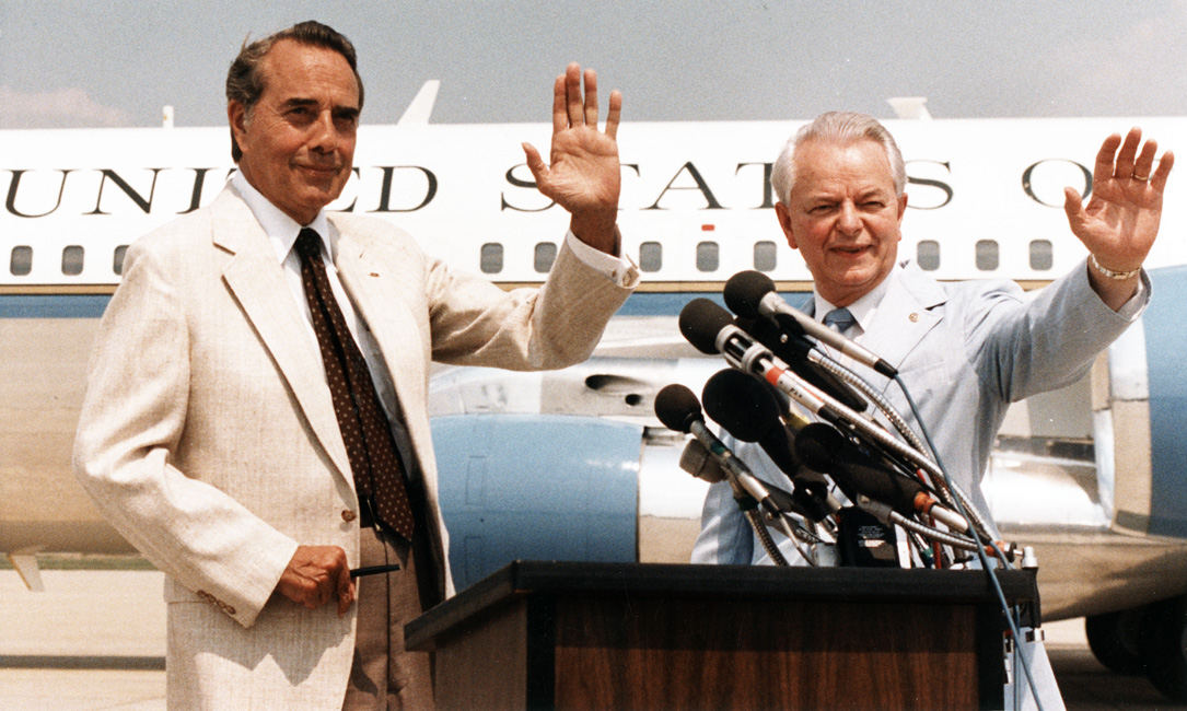 Bob Dole and Robert Byrd waving in front of an airplane | Dole Archive Collections