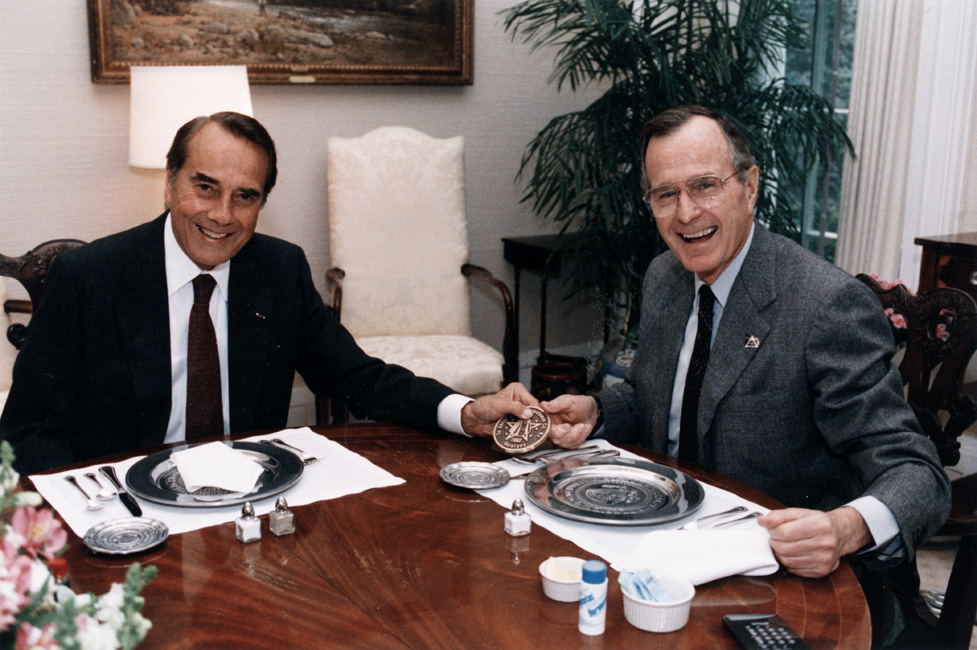 Bob Dole sitting ready for dinner with George H.W. Bush | Dole Archive Collections