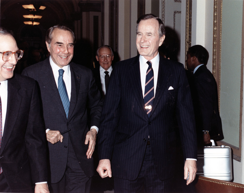 Bob Dole walking down the hallway with George H.W. Bush