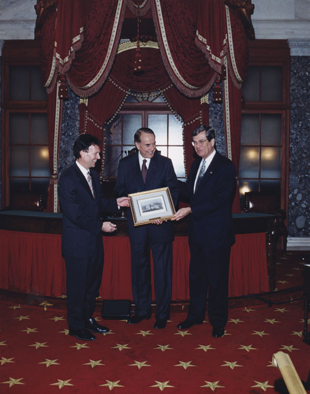 Daschle and Lot presenting Dole with framed sketch in Senate chamber | Dole Archive Collections