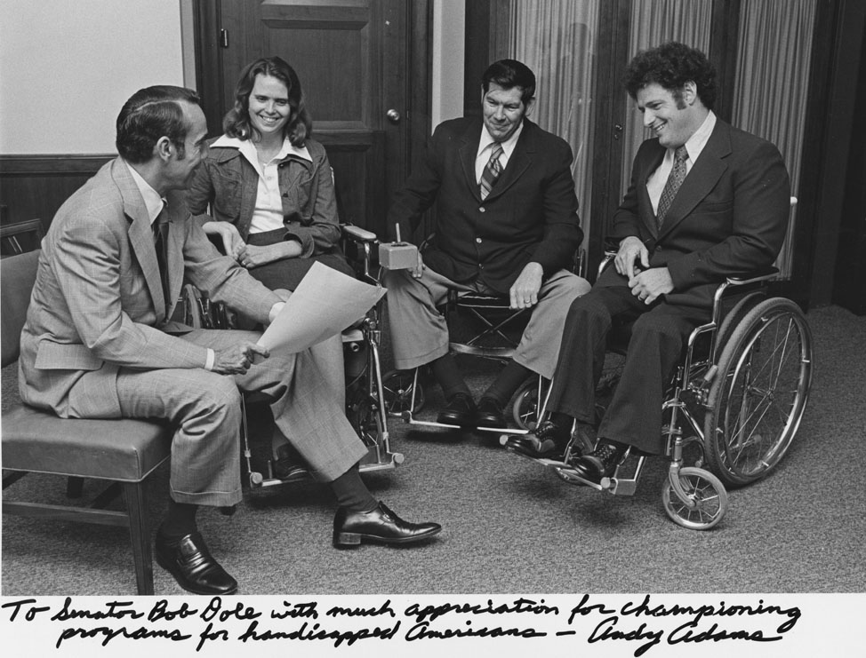 Item 7: Senator Dole and the Rehabilitation Services Administration. Inscriptions: Front: To Senator Bob Dole with much appreciation for championing programs for handicapped Americans-- Andy Adams, Back: Photo by: Frank J. Romano, Rehabilitation Services Administration.