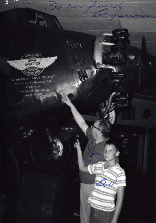 Father and Son (?) pointing to "Winner of Dole Flight" airplane