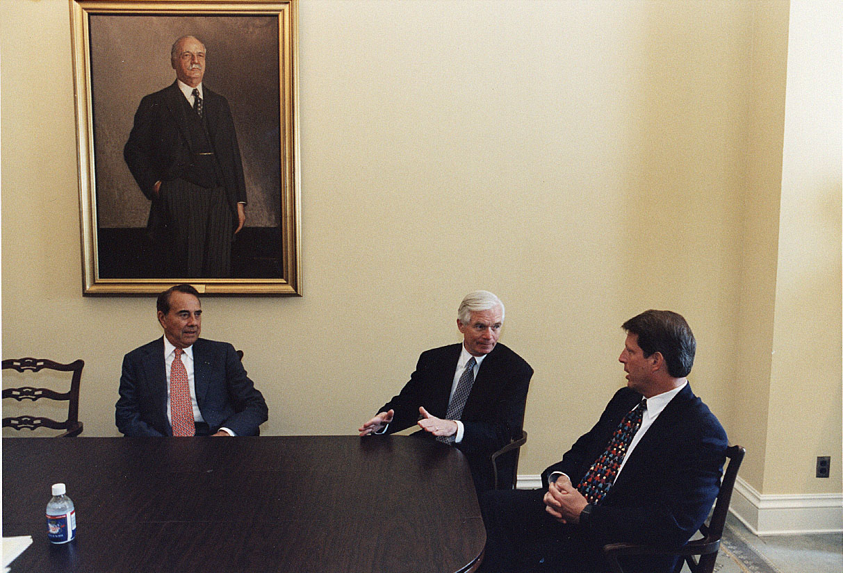 Al Gore, Thad Cochran, and Bob Dole in meeting in a yellow room