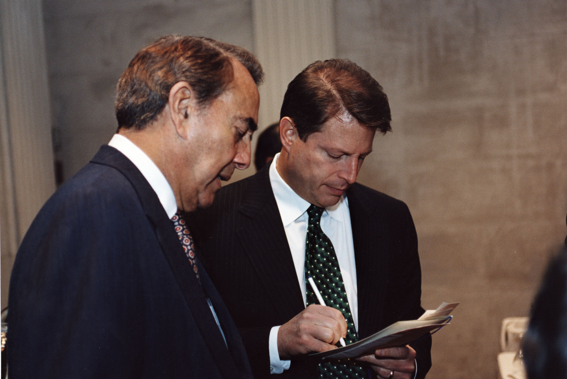 Bob Dole and Al Gore looking at paper