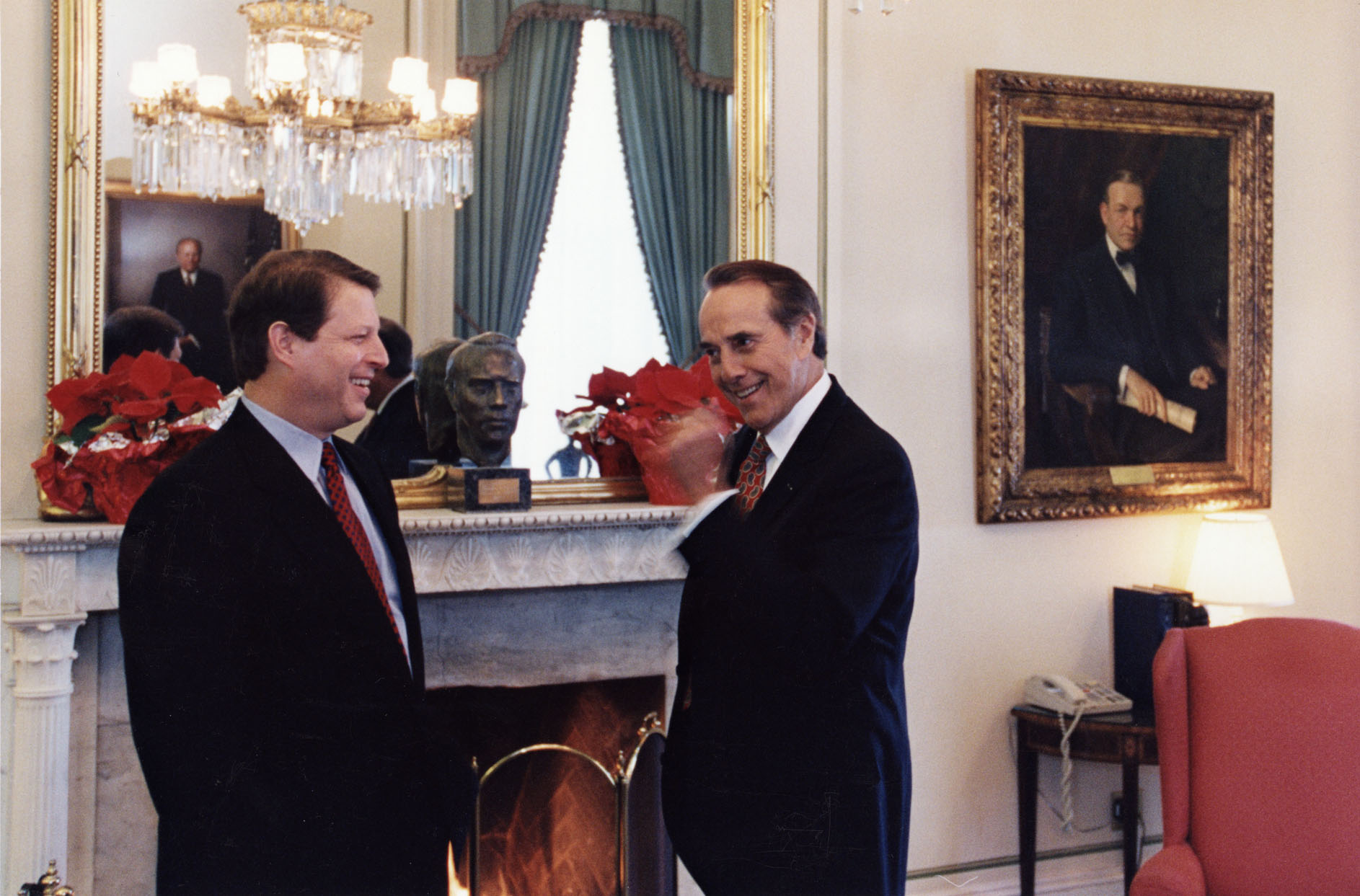 Bob Dole and Al Gore next to mantle | Dole Archive Collections