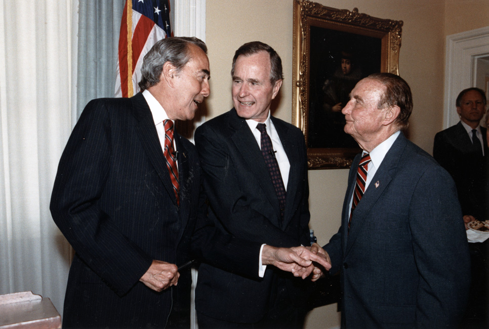 Bob Dole talking with George H.W. Bush and Strom Thurmond