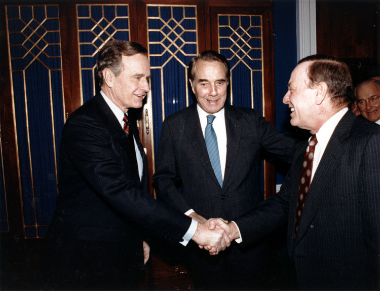 George H.W. Bush shaking hands, as Bob Dole looks on | Dole Archive Collections