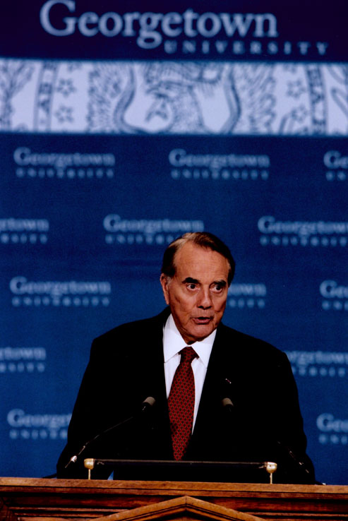 Sen. Dole at lectern with Afghan flag in background, at above event