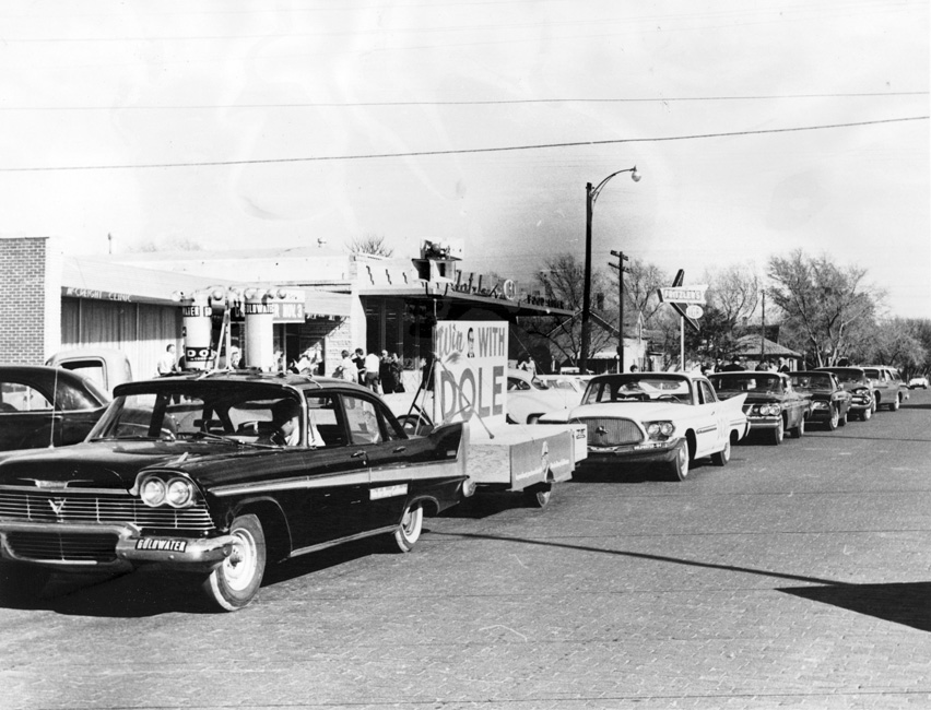 Bob Dole Caravan, Nov 2 1964, Ness City, Republican Headquarters. A caravan of cars, one pulling a sign that reads, "Win with Dole," are shown passing several stores in Ness City, Kansas. The lead car in the image has a Goldwater sticker on the front bumper. Names of stores shown in the image are: McCreight Clinic and Fritzler's IGA food store.