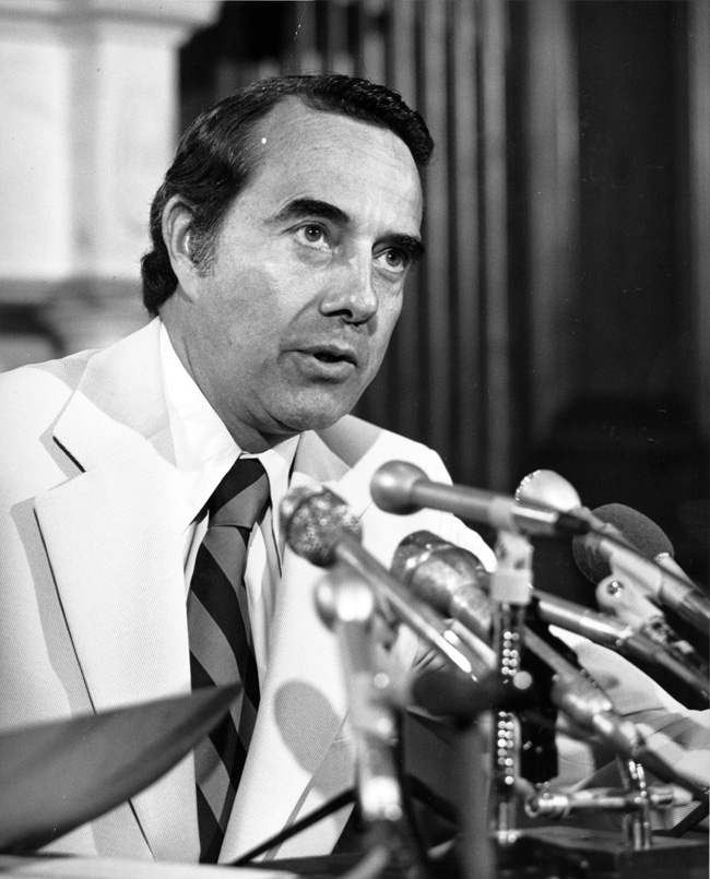 Bob Dole speaking into microphones